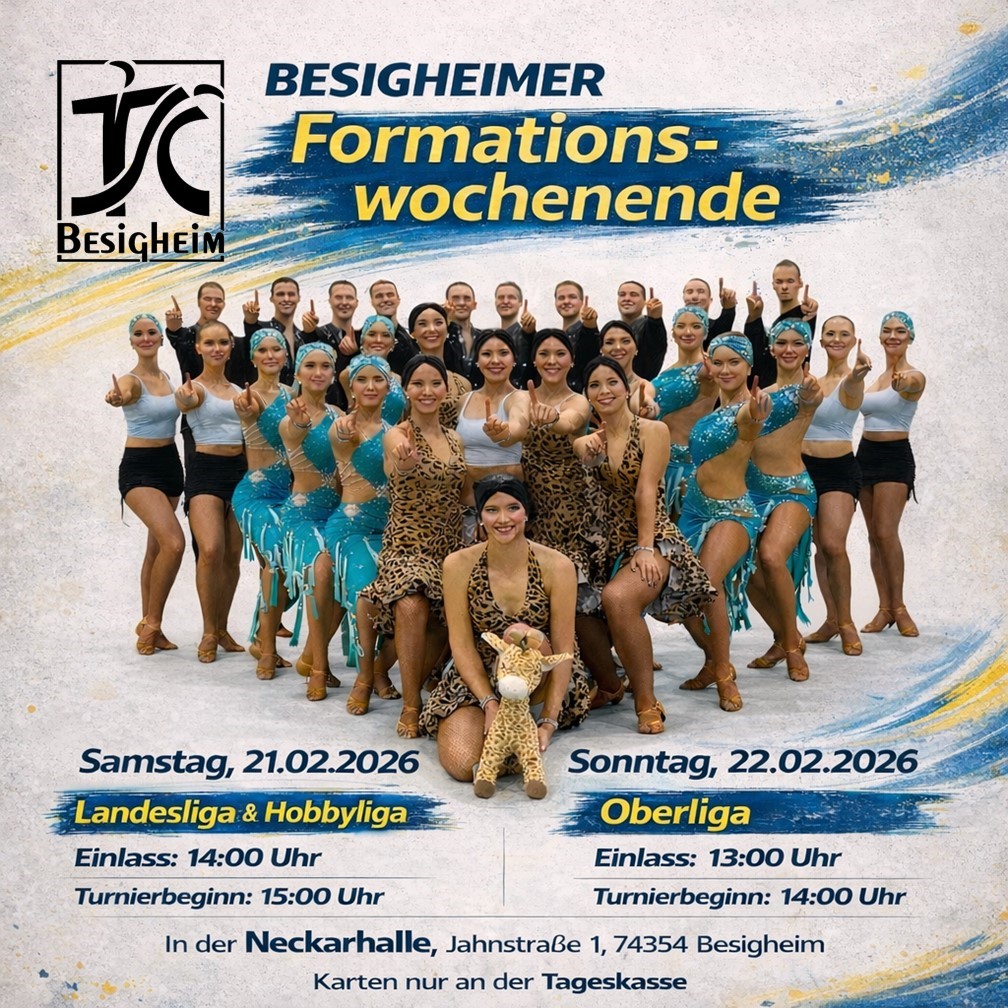 Am 21. und 22. Februar richtet der Tanzsportclub Besigheim Formationsturniere der Landesliga Süd TBW mit Hobbyliga und Oberliga Süd TBW in der Neckarhalle in Besigheim.